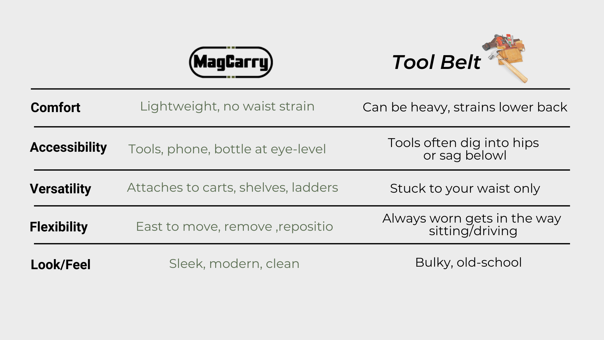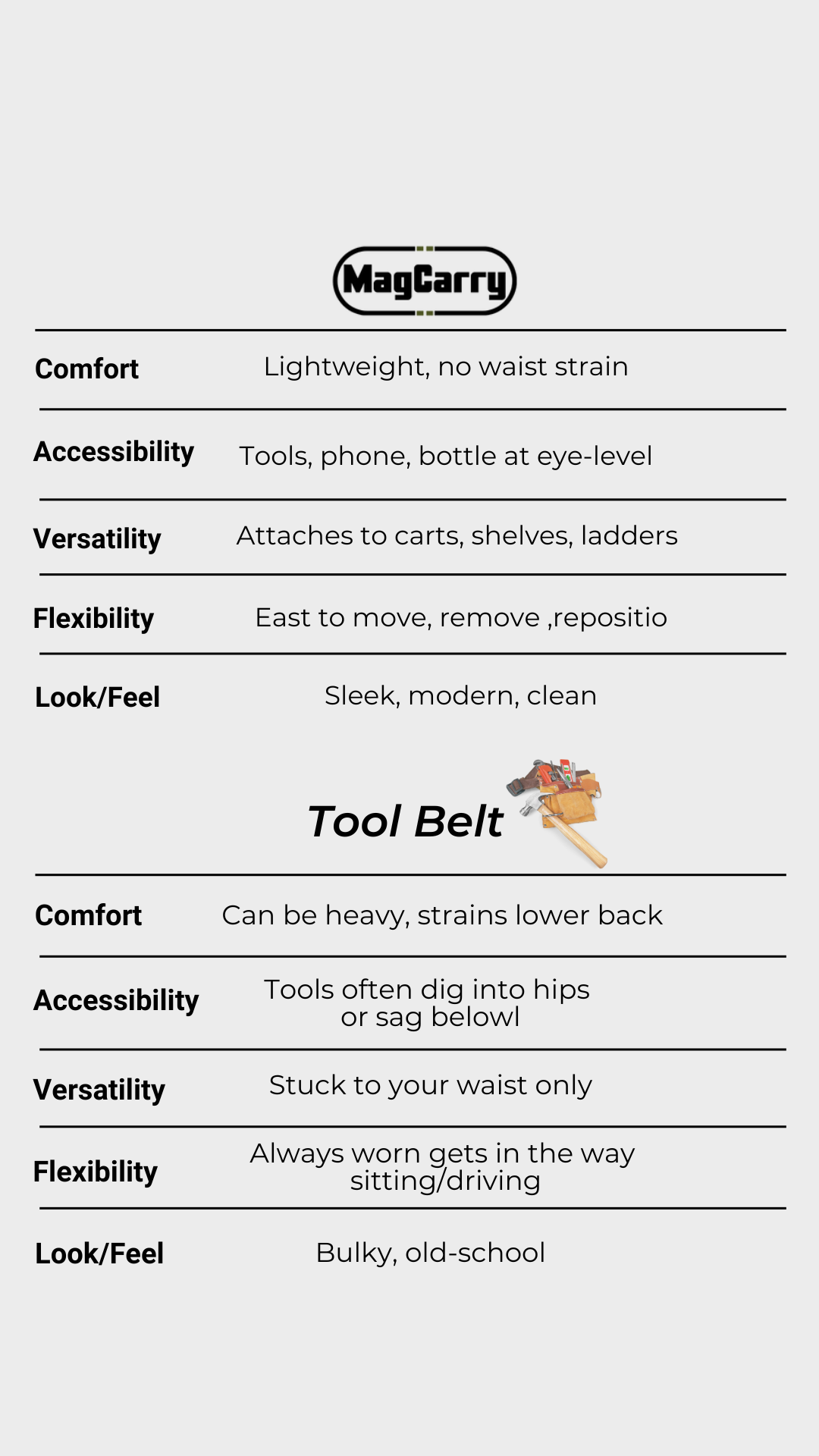 I’ve pretty much swapped my tool belt for the MagCarry. I throw it on a ladder or panel, drop in my essentials, and get to work. No more lugging around a heavy belt or digging for stuff—everything’s right there, off the ground and easy on the back.